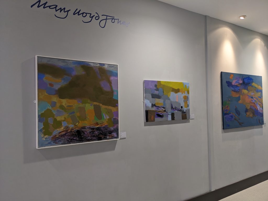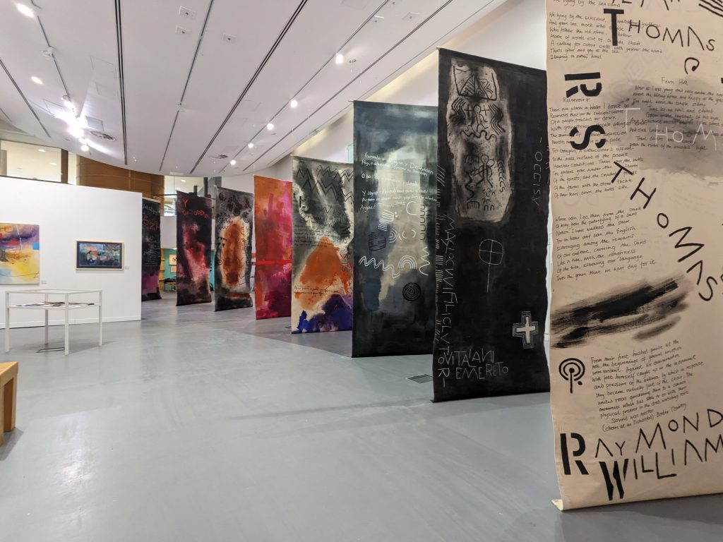 Hello! Welcome back to my blog. Today I wanted to talk about an exhibition I went to recently at the Arts Centre in my university. The artist being exhibited was Mary Lloyd Jones. She is a Welsh artist and her works are usually quite large unstretched paintings. For some of her paintings she uses cloth, stitching and dyes. Lloyd Jones’ work is inspired by the landscape and has an interest in early alphabets. She incorporates this into her artwork and uses ancient Bardic and Ogham alphabets as a reference to the otherness of Welshness.