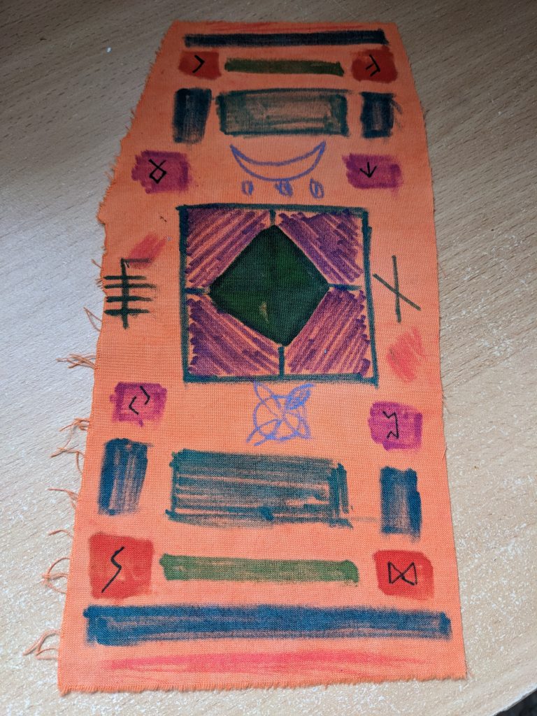 Whilst looking around the exhibition I had the chance to do an activity which involved making my own piece inspired by Mary Lloyd Jones’ work. As a lot of her work incorporates Welsh quilt patterns I thought I would add some patterns to my piece. I also used some Bardic and Ogham symbols. I really enjoyed this activity and discovering the ancient symbols and I was thinking about the scripts and symbols I was choosing to use and what they personally meant to me.